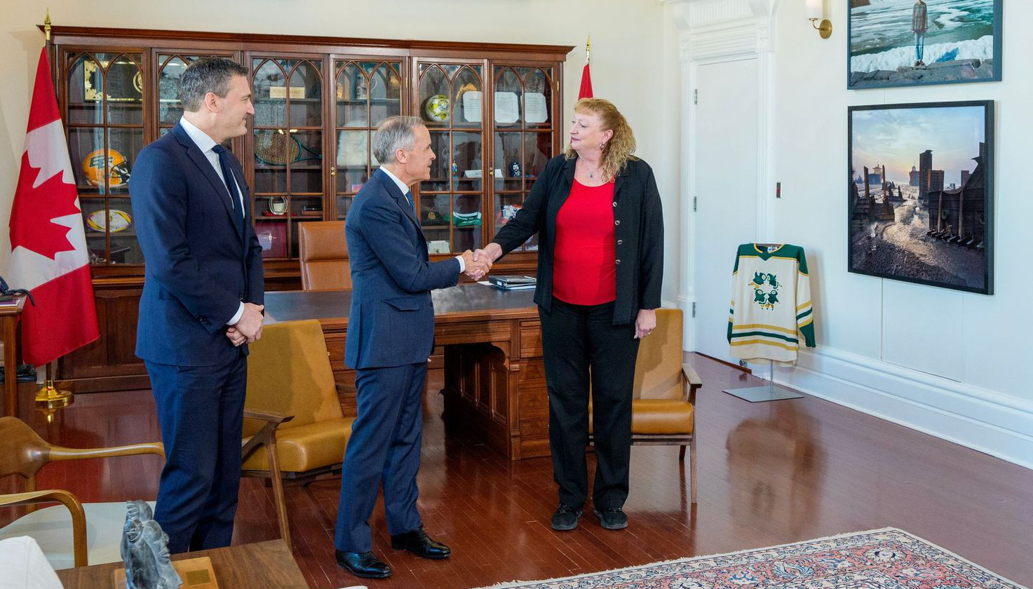 Prime Minister Mark Carney greets Ontario MP Marilyn Gladu in his Ottawa office. The somewhat conspicuous Inuit Tapiriit Kanatami hockey jersey can be seen in the background. (Photo courtesy of Lars Hagberg, the Prime Minister’s Office)