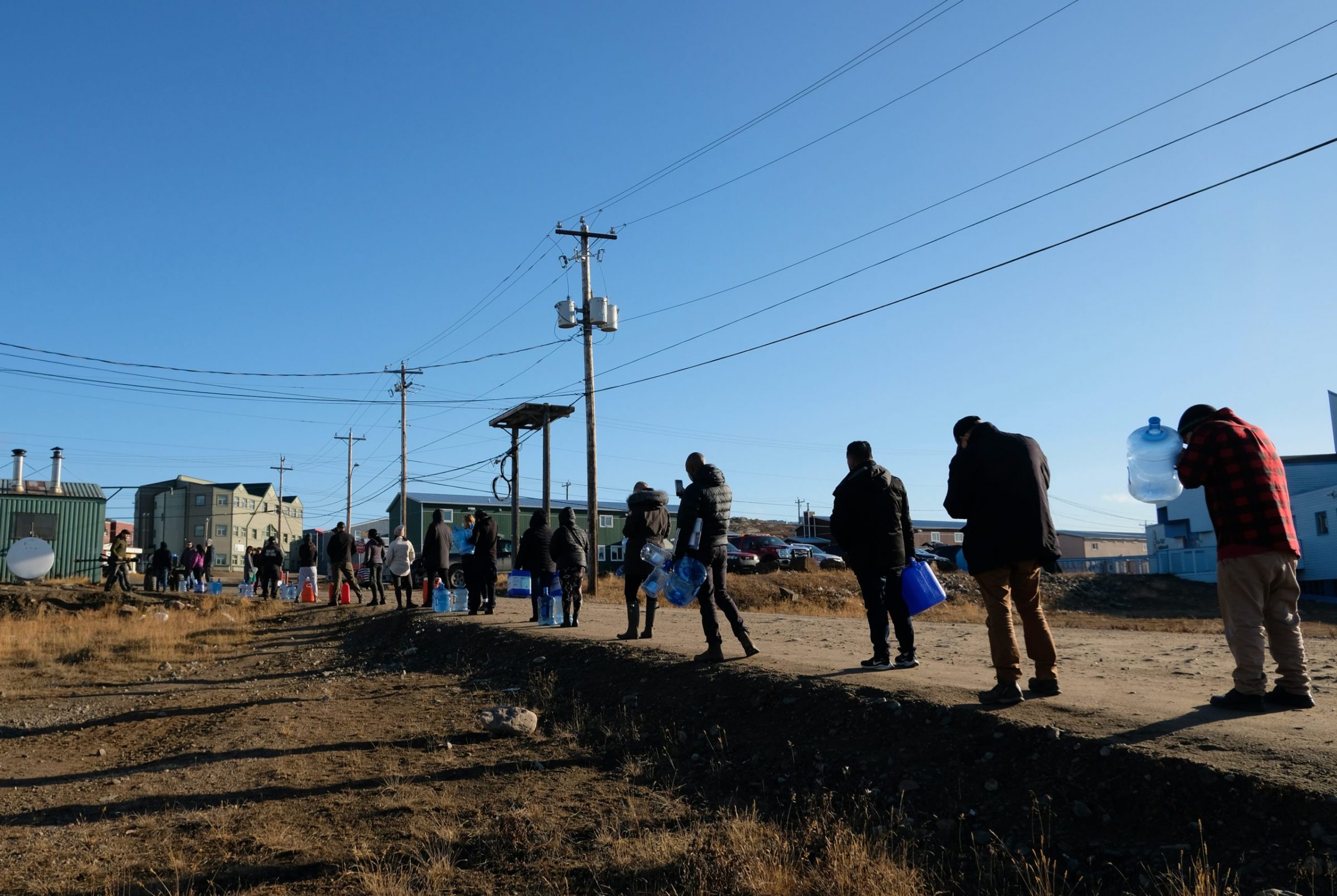 A day after the city issued a do not drink water notice, Iqaluit residents lined up to fill jugs of water at a fill station near the library. Iqalummiut will have to continue collecting water from filling stations as the city has pushed back its timeline for when the contaminated water will be flushed from the system. (File photo by Mélanie Ritchot)