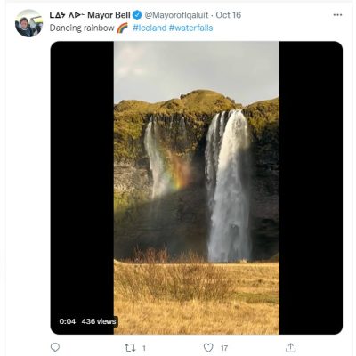 A post from former Iqaluit mayor Kenny Bell’s Twitter account on Oct. 18, 2022 shows him visiting a waterfall in Iceland. (Screenshot/Twitter)