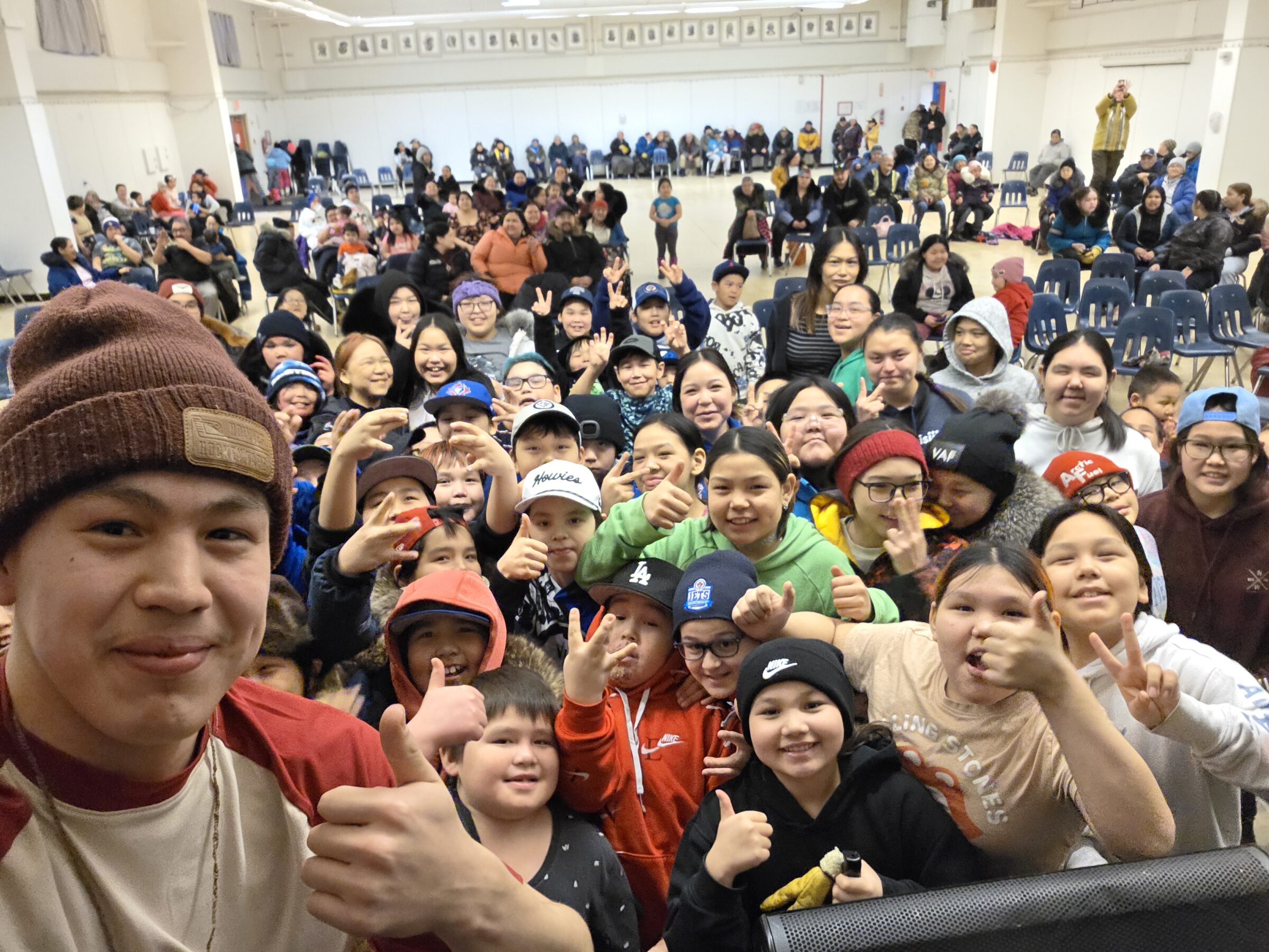 Ted Thomson, left, snaps a selfie from the stage at the Baker Lake community hall Saturday night. (Photo courtesy of Iqklu Killulark)