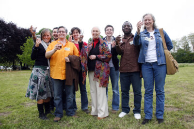 Denis Ndeloh, second from right, celebrates the 10-year anniversary of the Jane Goodall Institute in Amsterdam, Netherlands in May 2023. Goodall stands in the centre, wearing white pants, accompanied by staff from the organization. (Photo courtesy of Denis Ndeloh)