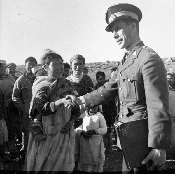 Locals on Belcher island meet an RCMP officer in 1949. (Credit: S.J. Bailey / Department of Indian and Northern Affairs / Library and Archives Canada)