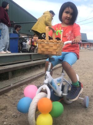 Scarlet Nowdlak, 3, presents her balloon bike to judges during the bike-decorating contest at the Arctic Winter Games arena, on Canada Day. Nowdlak won a fluorescent football a her sixth place prize. (Photo by Daron Letts)