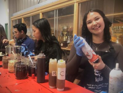 Emma Nadrowski, right, doles out whipped cream alongside co-workers Amare Castillo, left, and Kayla Tikiuik during the Canada Day pancake breakfast at the Arctic Winter Games Arena. (Photo by Daron Letts)