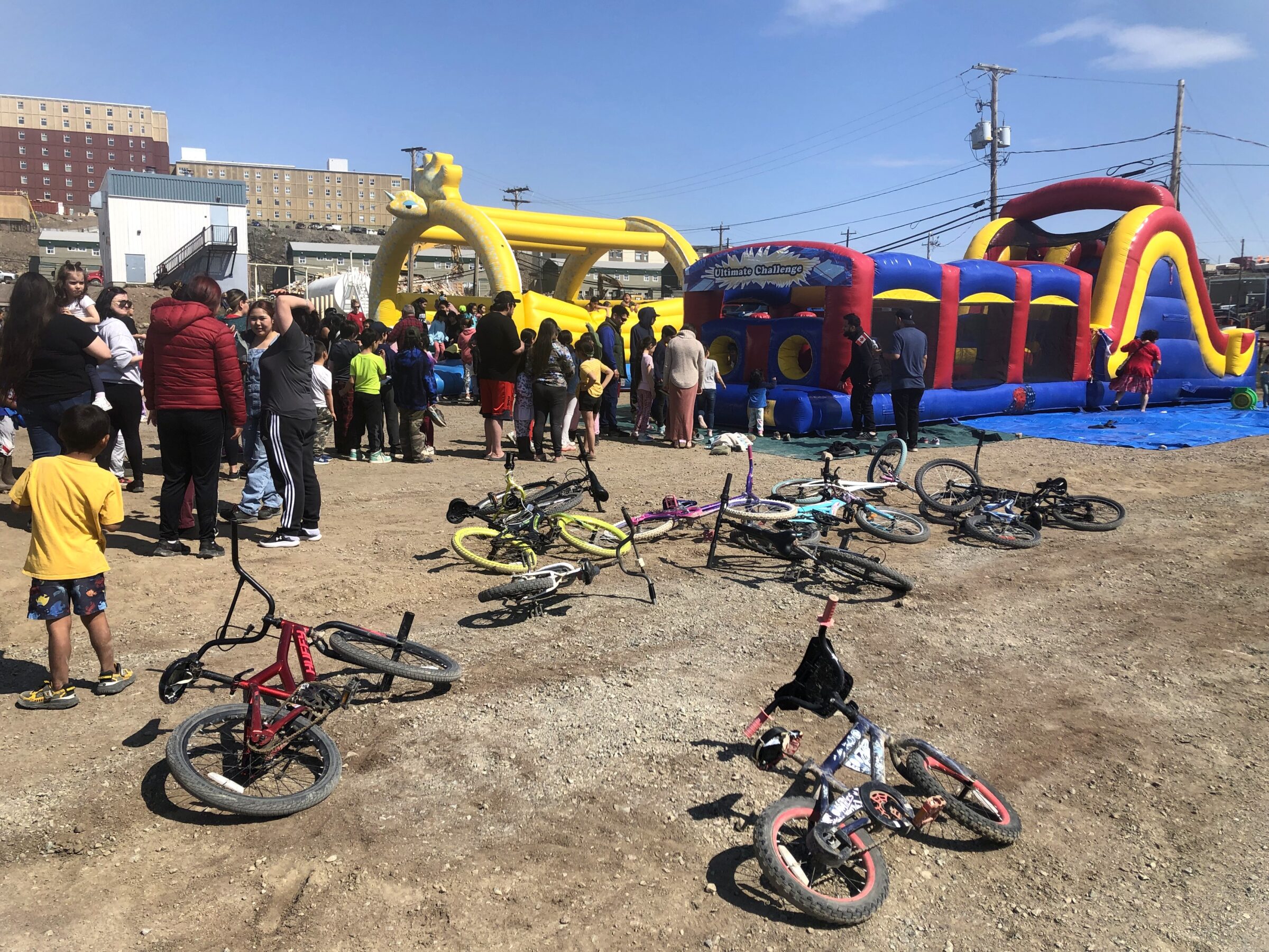 The bike-to-bouncy castle ratio explains the long lineup on the Nakasuk Elementary School grounds during Tuesday’s Canada Day festivities in Iqaluit. (Photo by Daron Letts)
