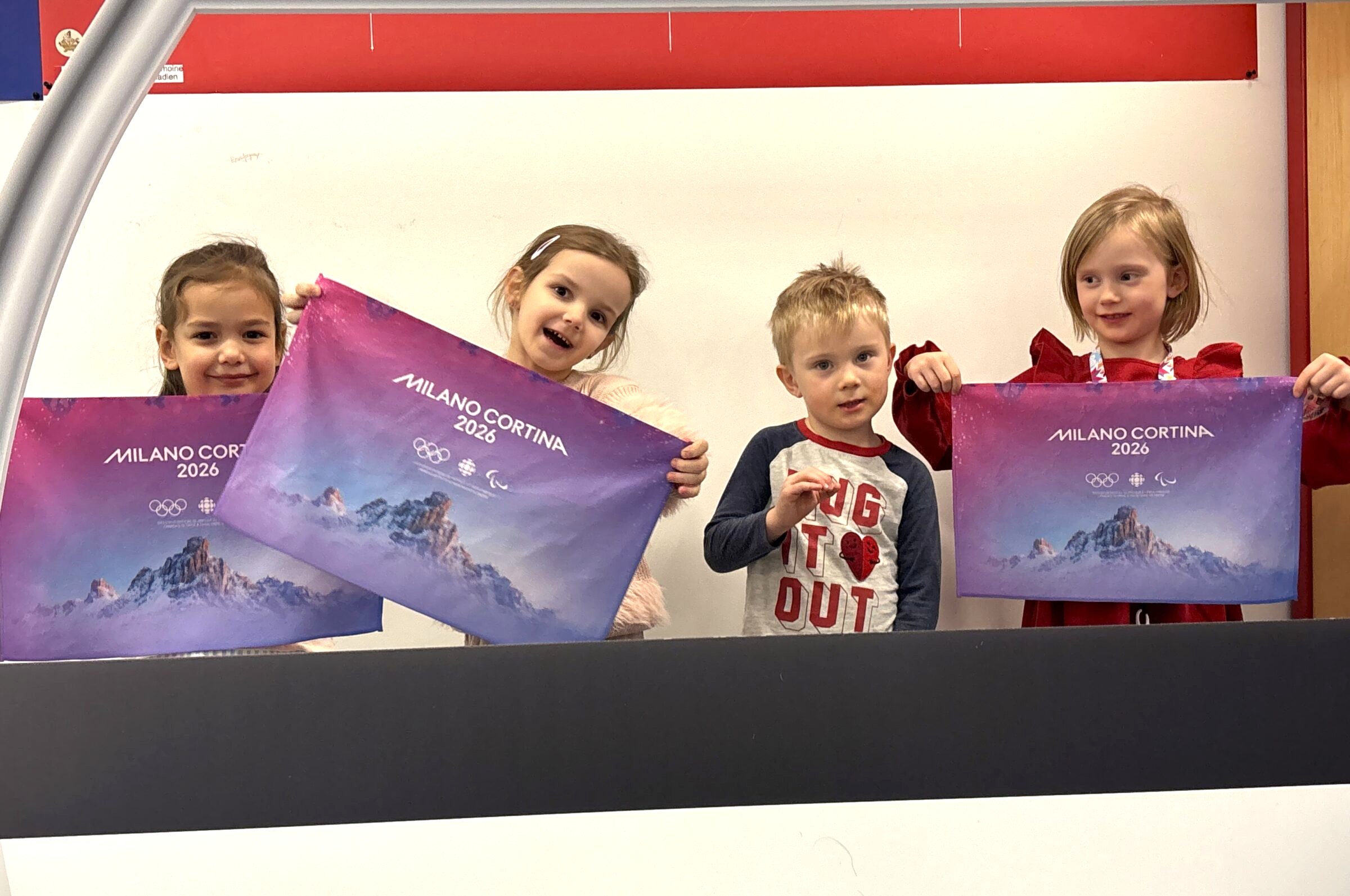 From left, Zoe Radmilo, Tara Dobratic, Hunter Hyndman and Willow Hyndman cheer on the Canadian men’s hockey team Friday afternoon, playing Switzerland at the Winter Olympics. Iqaluit’s Centennial library hosted a watch party for the Inuktitut-language broadcast of the game, which Canada won 5-1. Overall, at the Milano Cortina Games in Italy, Canada ranked 16th in the medal standings with three silver and four bronze medals as of Friday afternoon. Norway leads with eight gold, three silver and seven bronze. (Photo by Daron Letts)