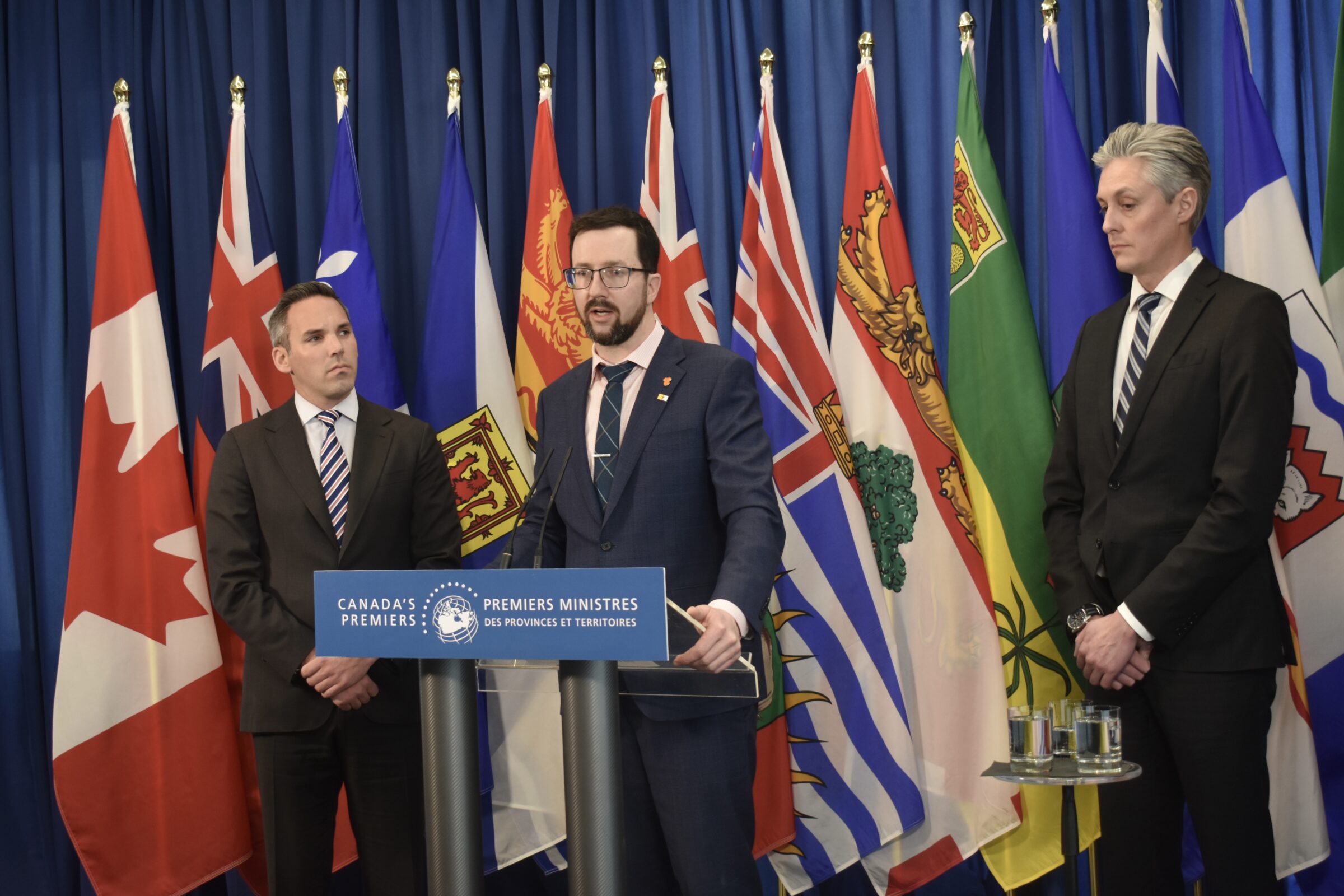 Nunavut Premier John Main, centre, speaks to reporters ahead of a premiers’ meeting in Ottawa Wednesday. He’s flanked by Yukon Premier Currie Dixon, left, and Northwest Territories Premier R.J. Simpson. The northern leaders discussed Arctic security, infrastructure, and economic development. (Photo by Nehaa Bimal)