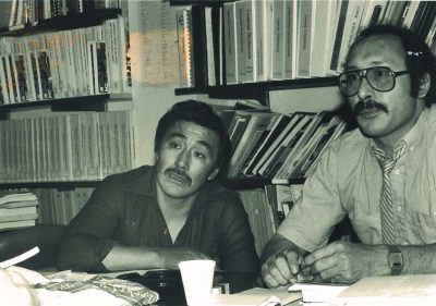 Donat Milortok, left, and former negotiator James Arvaluk in October 1984. (Photo courtesy of Nunavut Tunngavik Inc.)