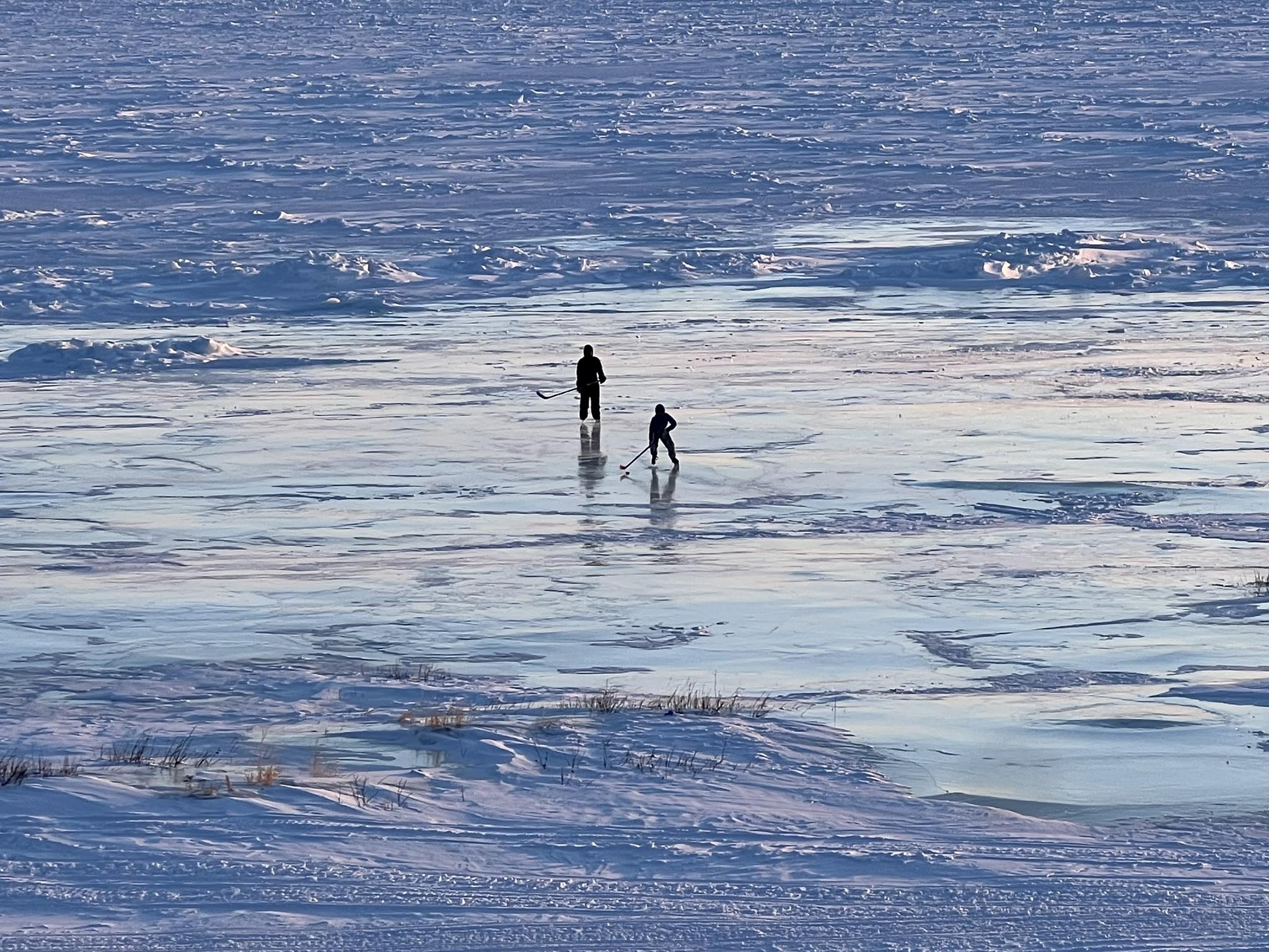 Two people play hockey on the ice in Umiujaq on April 3. “I was waiting for the perfect hockey skate position,” said photographer Anne Lapierre, who is in the community for census work and saw a group of about six players on the frozen riverbank, roughly 150 metres from the Co-op Hotel, that evening. (Photo courtesy of Anne Lapierre)