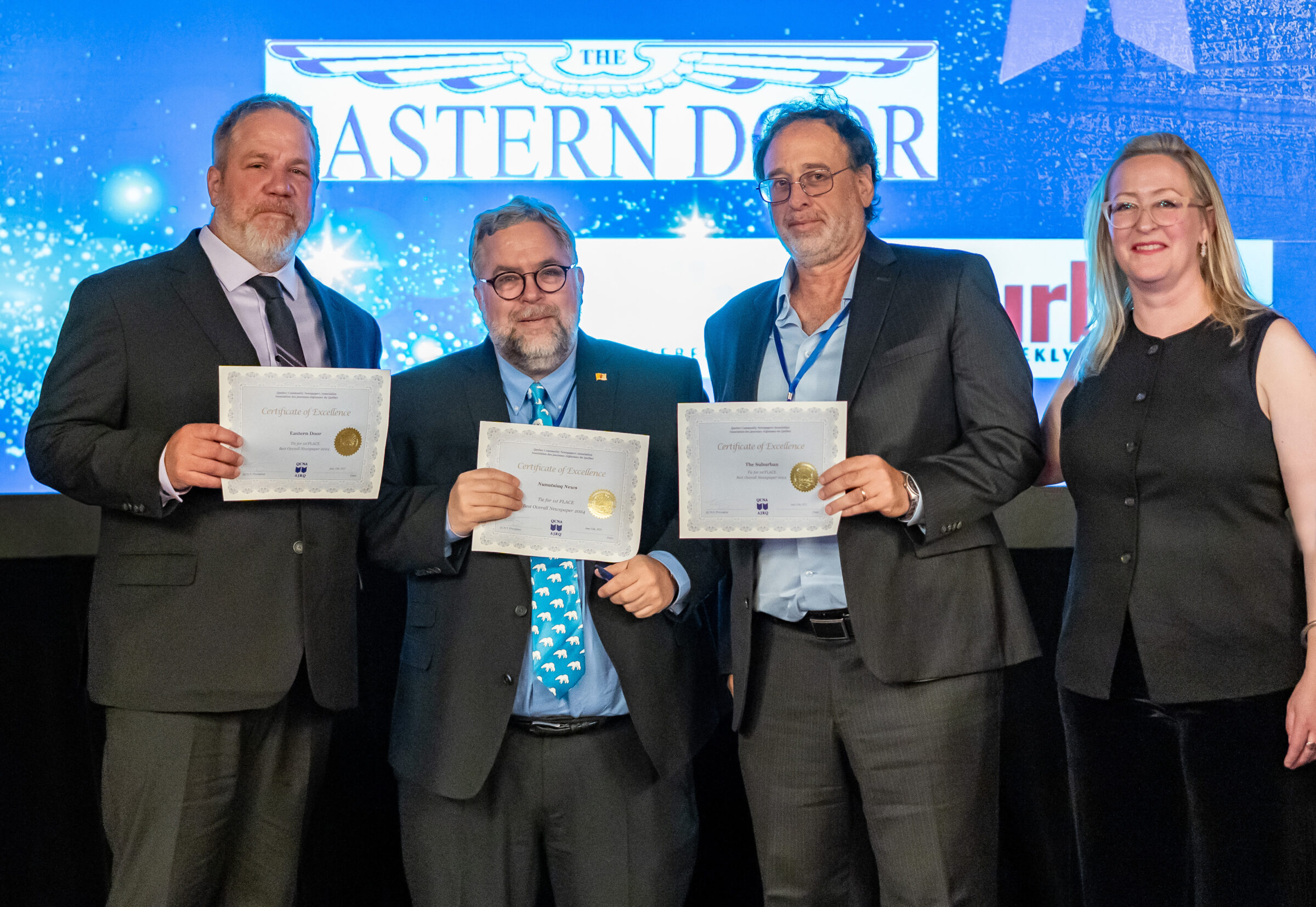 Nunatsiaq News managing editor Corey Laroque, second from left, accepts one of three certificates for Best Overall Newspaper at the Quebec Community Newspaper Awards gala June 13 in Montebello, Que. He is pictured with Steve Bonspiel, editor/publisher of the Eastern Door, left, Michael Sochaczevski, publisher of the Suburban, second from right, and Ilka de Laat, general manager Quebec Community Newspaper Association. (Photo by Savanna Oliver, courtesy of Quebec Community Newspaper Association)