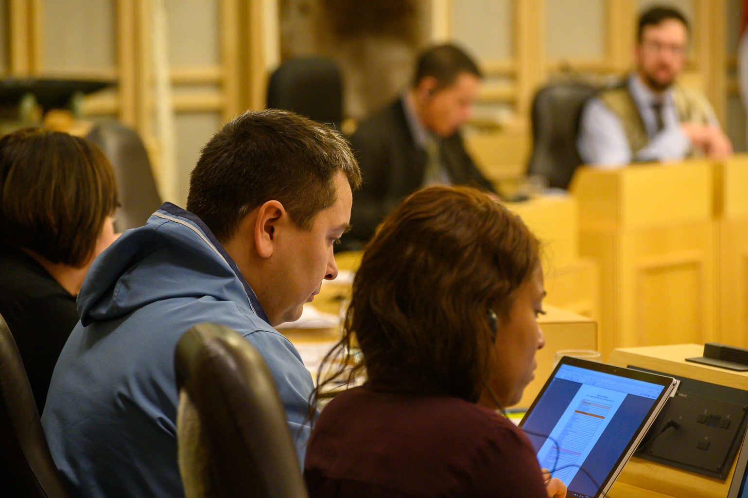 Education Minister David Joanasie consults his laptop while responding to a question on Thursday, Nov. 28, the final day of the Bill 25 hearing. (Photo by Dustin Patar)