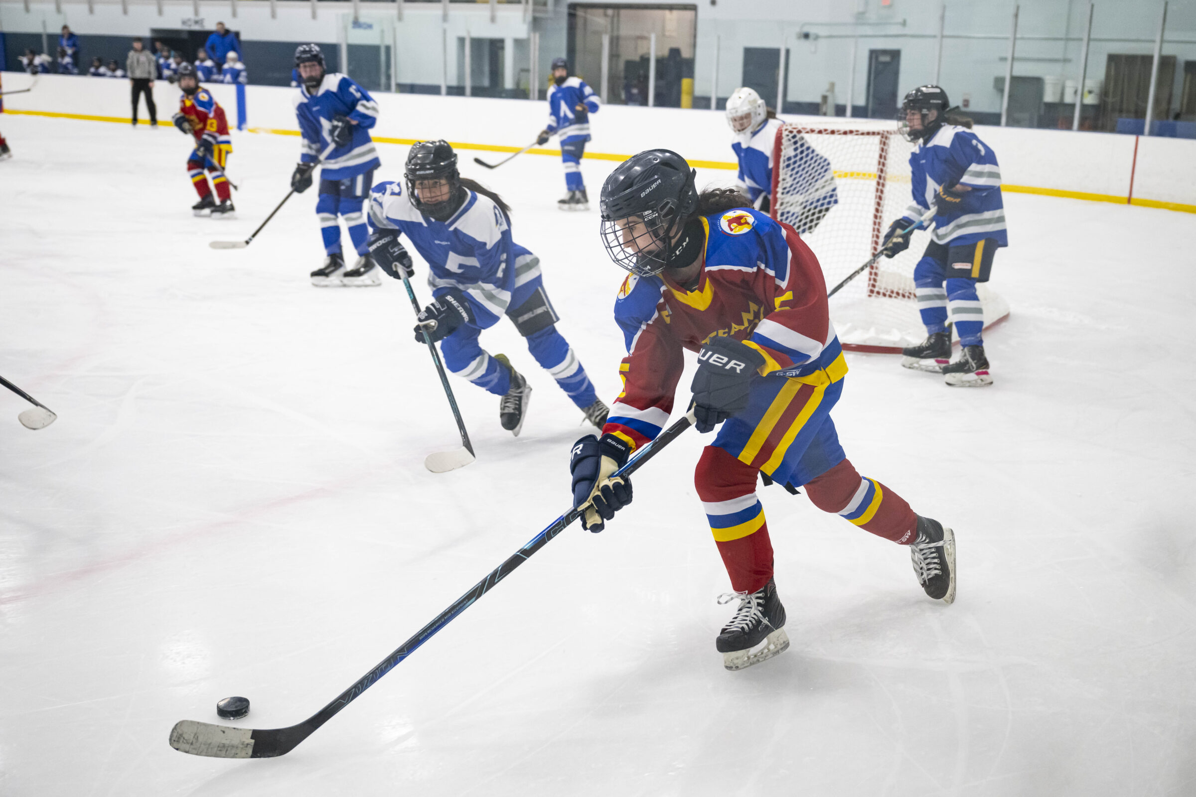 Mika Simic of Nunavut’s U19 female hockey team circles the offensive zone during a game against Team Alberta at the Canada Games Centre in Whitehorse, Yukon on Sunday, March 8, 2026. (Photo by Dustin Patar, special to Nunatsiaq News)