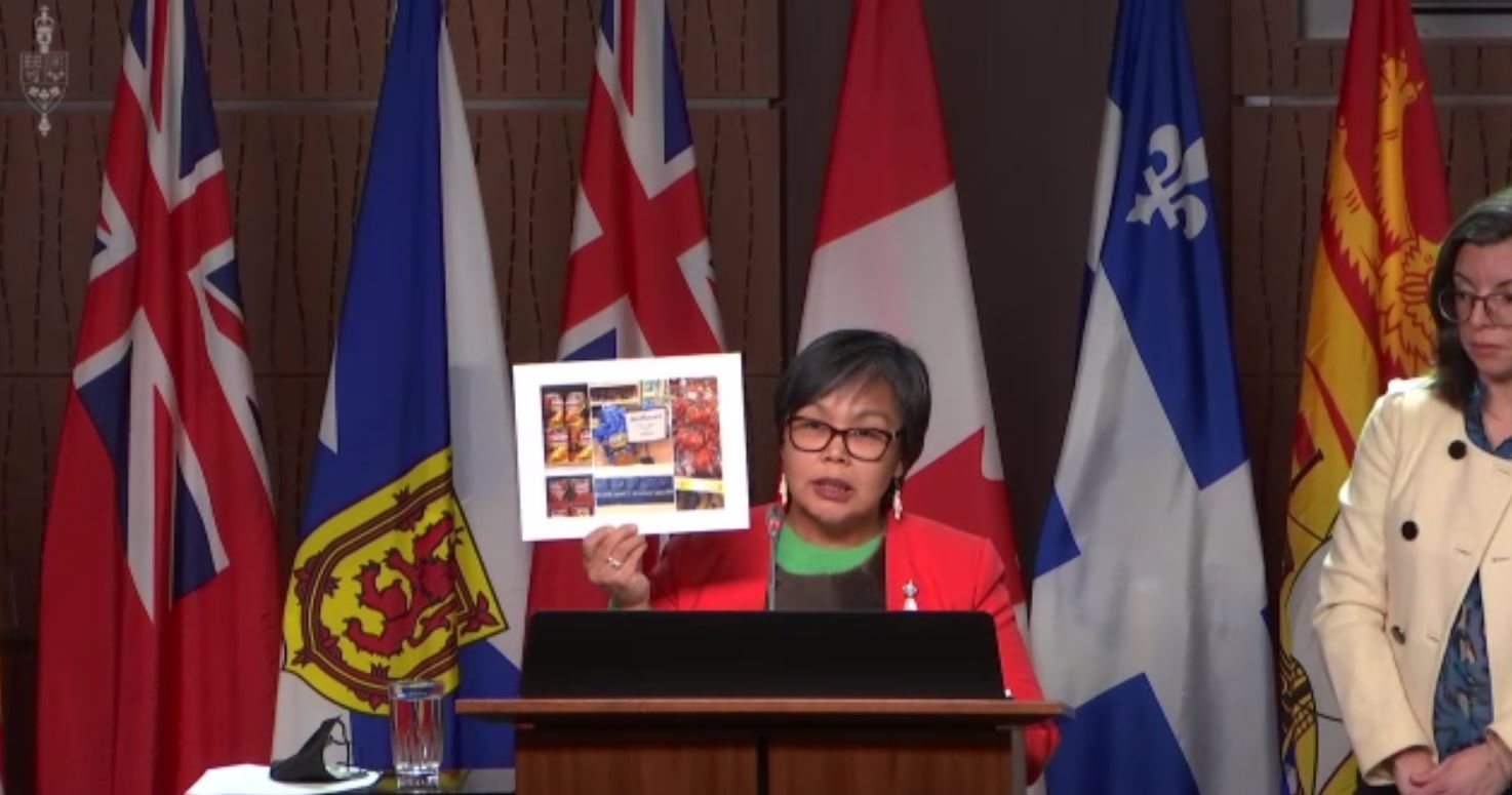 Nunavut MP Lori Idlout holds up a picture of grocery store items while talking during a Wednesdasy press conference in Ottawa about the high prices Nunavummiut face. NDP MP Niki Ashton, who took pat in the joint press conference, looks on. (Screenshot courtesy of Parliamentary Press Gallery)