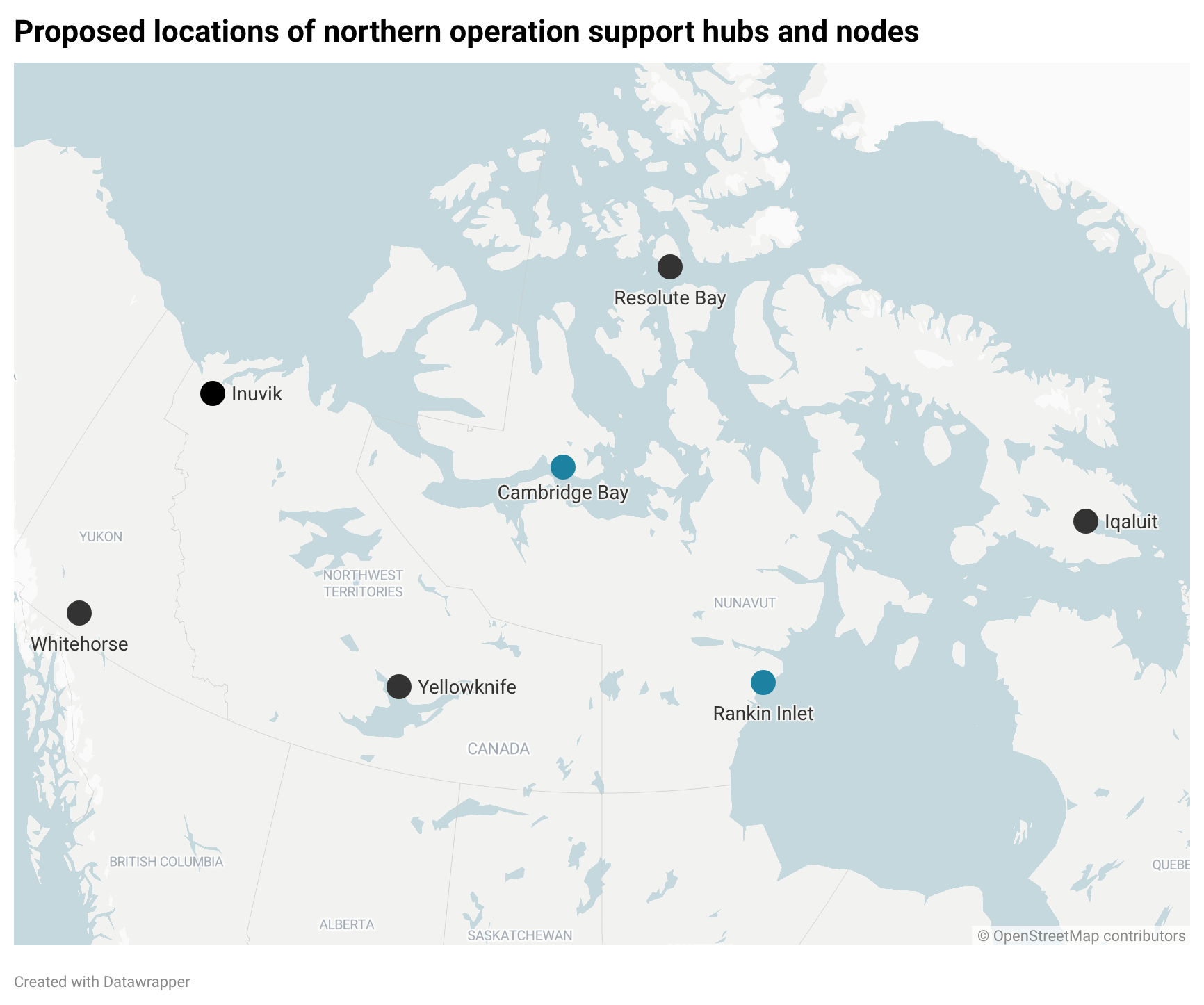The federal government plans to build five operational support hubs in Inuvik, Iqaluit, Resolute Bay, Whitehorse and Yellowknife along with smaller “nodes” in Cambridge Bay and Rankin Inlet. (Map by Nunatsiaq News)