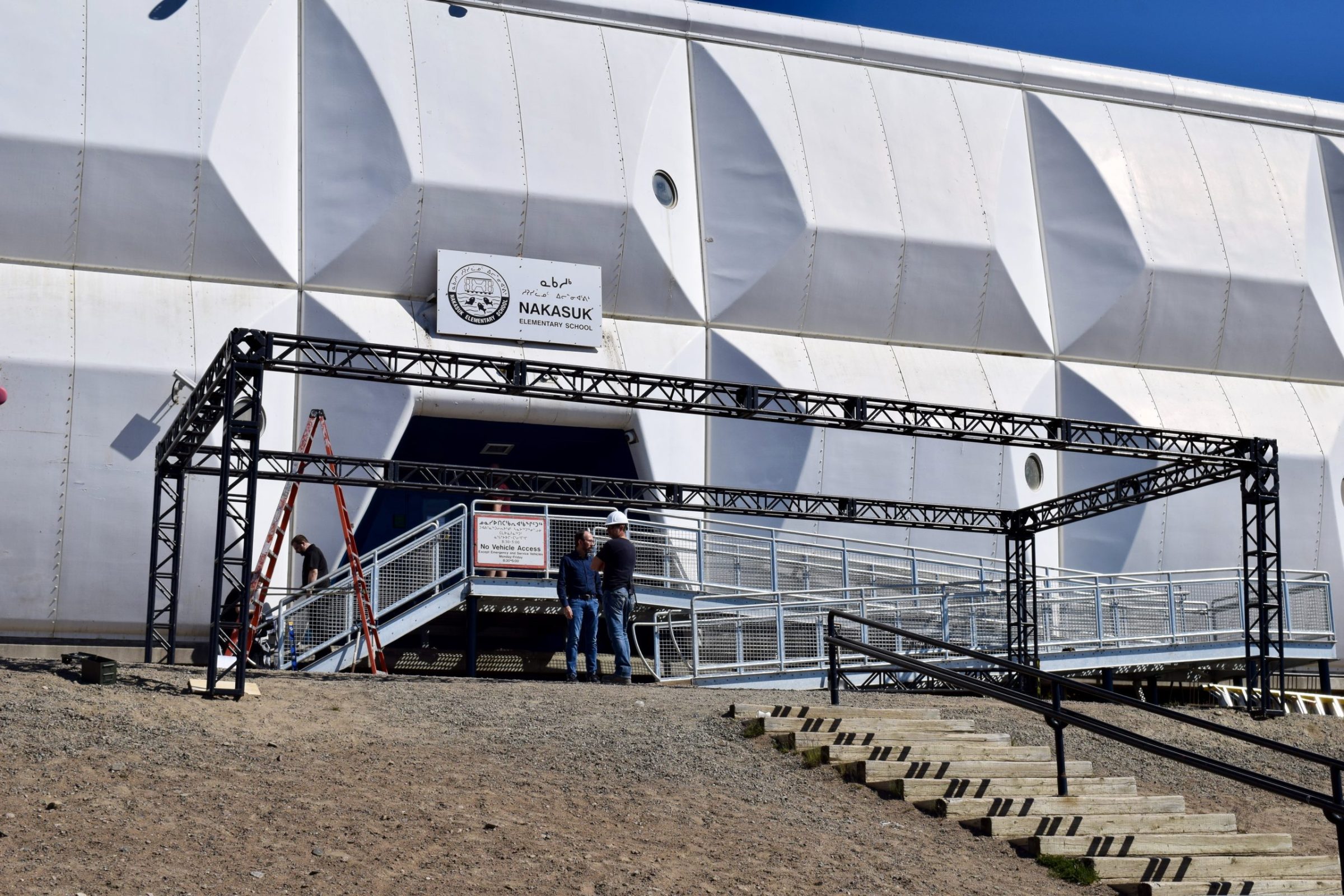Workers from NCC Development Ltd. set up a temporary stage Tuesday outside Nakasuk Elementary School in Iqaluit. Pope Francis is expected to arrive in Iqaluit on Friday to meet with survivors of the residential school system once run by the Catholic Church, before holding a public event around 5 p.m. It’s estimated 150,000 Inuit, First Nations, and Metis children attended residential schools from the 1800s up to the 1990s. Many Indigenous children suffered abuse there. (Photo by Madalyn Howitt)