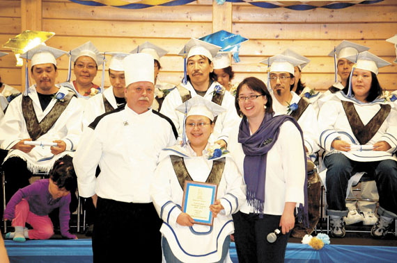 Valerie Ohokannoak, standing with chef instructor Andrew Poisson (left) and Fiona Buchan-Corey (right), Cambridge Bay’s Nunavut Arctic College campus director, receives an award for her excellence in the NAC’s culinary arts program during graduation ceremonies held April 15 in Cambridge Bay. (PHOTO COURTESY OF KEVIN MCGILL)