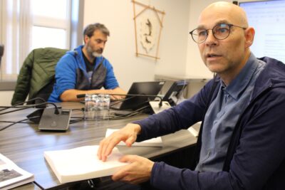 Project architect Thomas Jørgensen of Dorte Mandrup Arkitekter, the Danish firm selected to design the centre, describes the materials used in the build. Torsten Diesel, director of projects with Inuit Heritage Trust, works in the background. (Photo by Daron Letts)