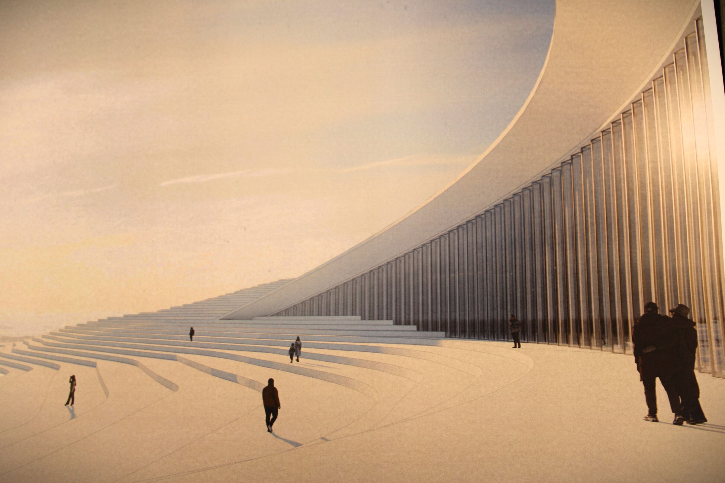 This diagram of the planned Nunavut Inuit Heritage Centre in Iqaluit shows the view from the Frobisher Bay side of the structure. (Illustration courtesy of Annette Kurtzmann/Dorte Mandrup Arkitekter)