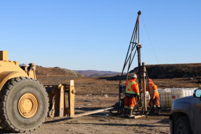 A crew conducts geotechnical sampling on the road to Apex, on Monday. The current design for the proposed Nunavut Inuit Heritage Centre would span the gap between the two hills pictured here in the background. (Photo by Daron Letts)