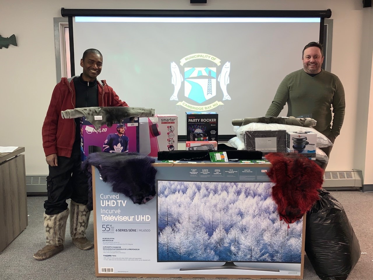 Wayne Gregory and Valter Botelho-Resendes stand next to a table laden with prizes they later handed out to lucky bingo players on Saturday, March 28, in Cambridge Bay. The community-wide bingo, sponsored by the hamlet, was promoted as a stay-at-home, social distancing affair. Another bingo is scheduled for this coming Saturday evening. (Photo courtesy of the Hamlet of Cambridge Bay)
