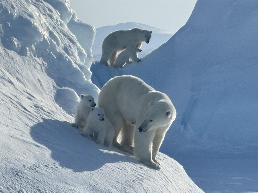A lot of “polar bear fanatics” come to Qikiqtarjuaq to take photos of bears outside of the community, says Billy Arnaquq. He took the photos of two mother bears with their cubs in spring 2025. (Photo courtesy of Billy Arnaquq)