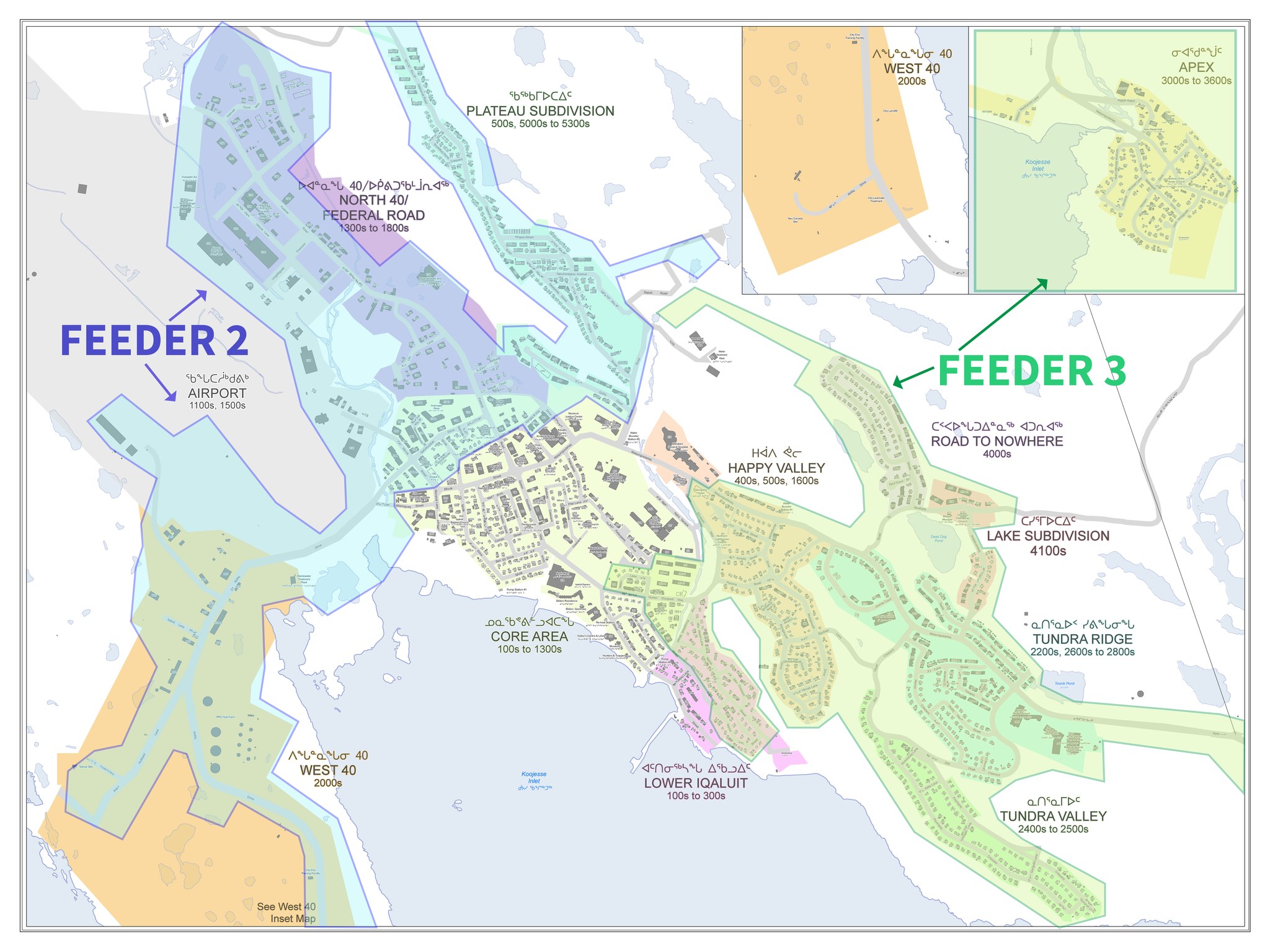 Qulliq Energy Corp. is advising Iqaluit residents of outages impacting most of the city this weekend. The area marked as FEEDER 2 will be offline Saturday from 8 to 11 a.m., while the area marked as FEEDER 3 will be out the same time Sunday. (Image courtesy of Qulliq Energy Corp.)