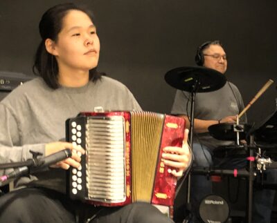 Mary Itorcheak plays accordion while Norbert Poitras plays drums on stage in the Nakasuk Elementary School gym Friday during the Qikiqtani Inuit Association’s 50th annviversary celebration. (Photo by Daron Letts)