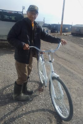 Jarloo Kiguktak, recreation director in Grise Fiord, is pictured with a bicycle donated by Green Sun Rising Inc. The company ships bicycles along with its materials during solar installations. (Photo courtesy of Green Sun Rising Inc.)