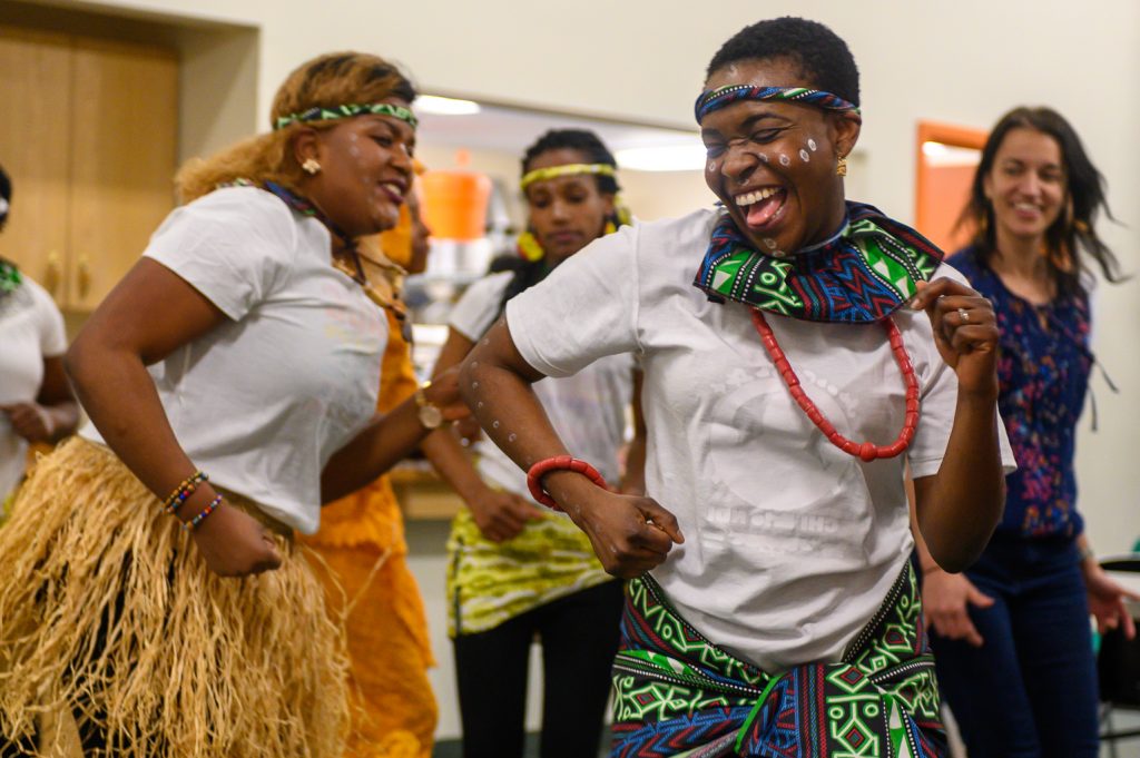 Claris Forbongo (left) and Omanola Djalogue (right) perform with other members of Danz’Afro folk during the Kwanzaa celebration on Sunday night, Dec. 29. (Photo by Dustin Patar)