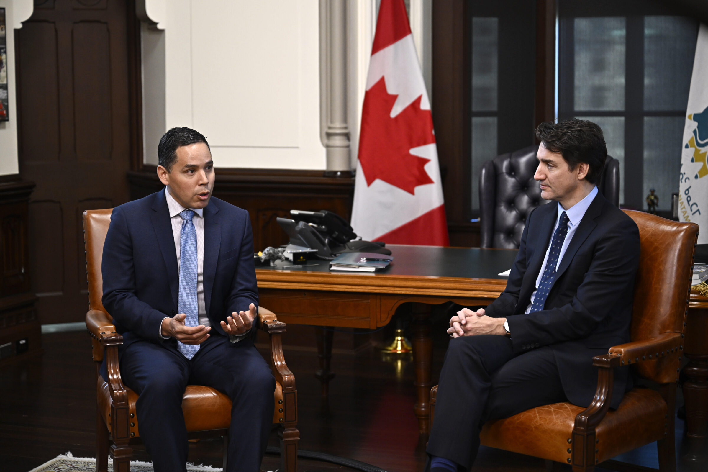 Prime Minister Justin Trudeau, right, meets with Natan Obed, president of Inuit Tapiriit Kanatami, in Trudeau’s office on Parliament Hill in Ottawa on Tuesday. (Photo by Justin Tang, The Canadian Press)