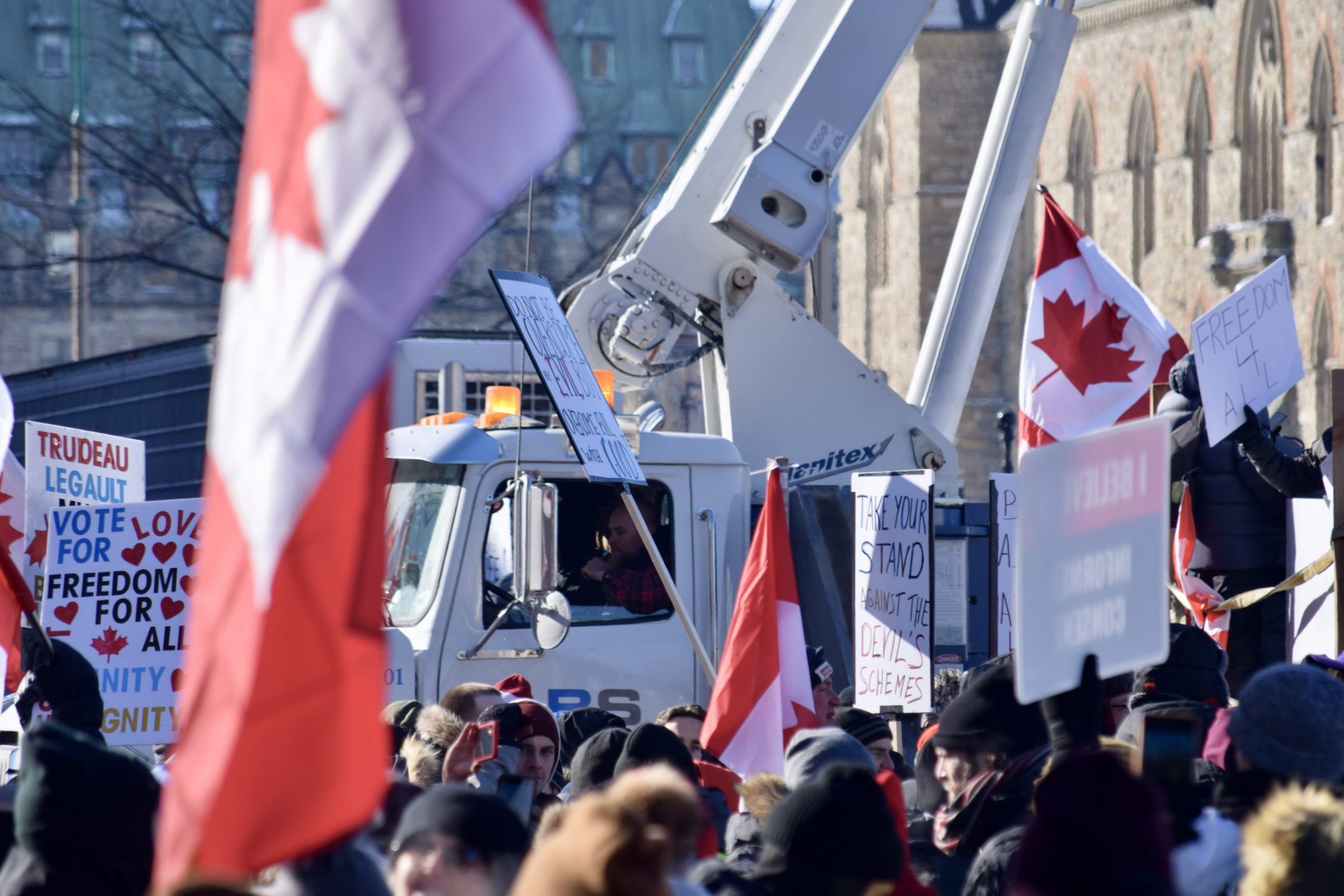 Supporters of the Freedom Convoy gather near Parliament Hill in Ottawa on Jan. 29 protesting government vaccine and health mandates. Tungasuvvingat Inuit says the demonstrations are impeding its ability to support vulnerable Inuit. (Photo by Madalyn Howitt)