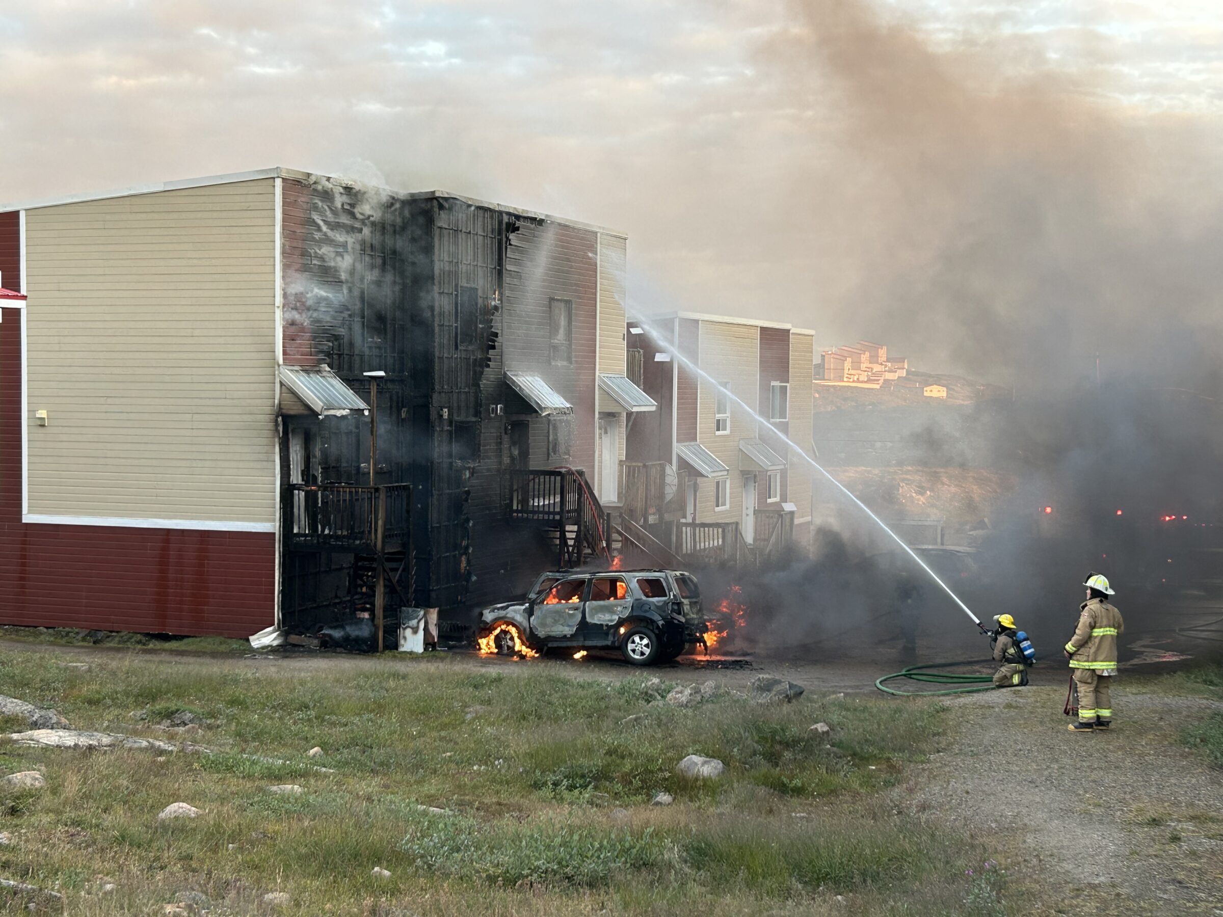Two vehicles and two residential apartment units were severely damaged in a fire in Iqaluit Saturday night that forced at least eight residents out of their homes.