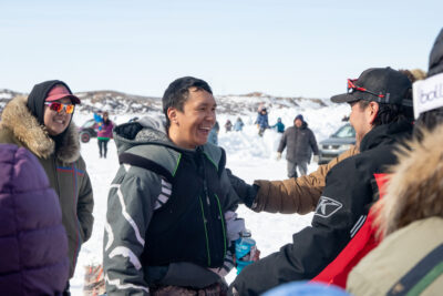 Akavak pulled a bottle of orange juice from a pack on his snowmobile and chugged it back while he waited for other racers to cross the finish line on the sea ice in front of Iqaluit’s marina.