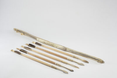 Seen here, gear for bow hunting which includes a bow made from pieces of caribou antler and nails. Prior to having access to metal, walrus whiskers or threads of caribou sinew were used to hold the bow to together. These arrows are made from wood, but they were often made of caribou antler or bone since wood wasn’t readily available. (Photo courtesy of Inuit Worlds)