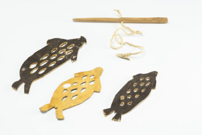 Primarily played by boys, this seal-hunting game (nattirasunguarutiit) recreated harpooning a seal at its breathing hole (aglu). One contestant had to “hit one of the holes on the seal, while another player moved the seal bone or the pieces of sealskin,” according to the museum’s website. (Photo courtesy of Inuit Worlds)