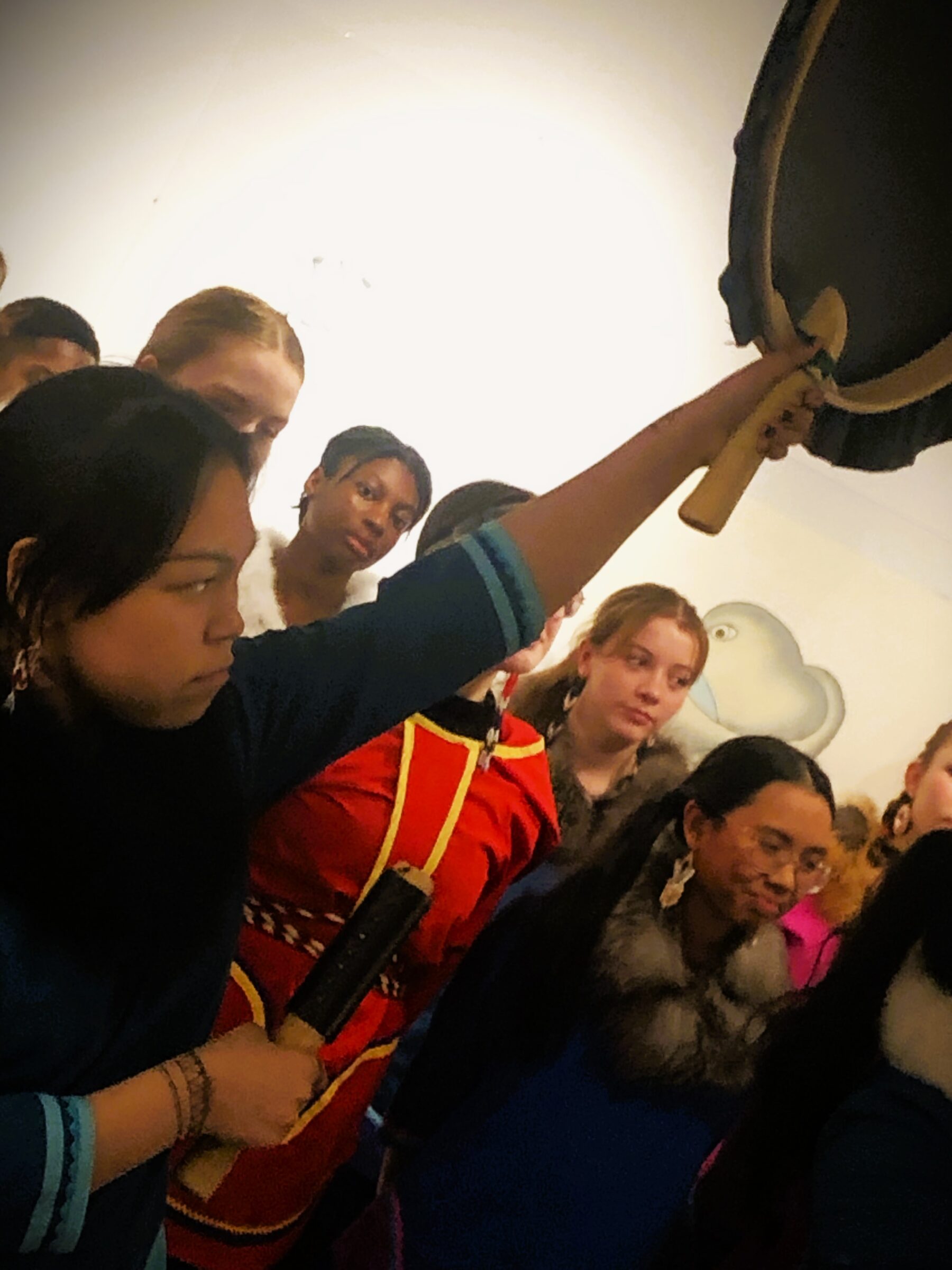 Inuksuk High School student Mia Pitseolak, drums to “This Child,” by Susan Aglukark, alongside the rest of the Inuksuk Drummers at Nunatta Sunakkutaangit Museum on Dec. 6, 2024. The Qulliit Nunavut Status of Women Council is planning a walk another event Saturday in recognition of the 36th annual National Day of Remembrance and Action on Violence Against Women. (File photo by Daron Letts)