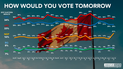 Abacus Data polled 1,500 Canadians on who they would vote for if there was on election tomorrow from June 10-16. (Data collection and Graphic by Bruce Anderson & David Coletto, Abacus Data)