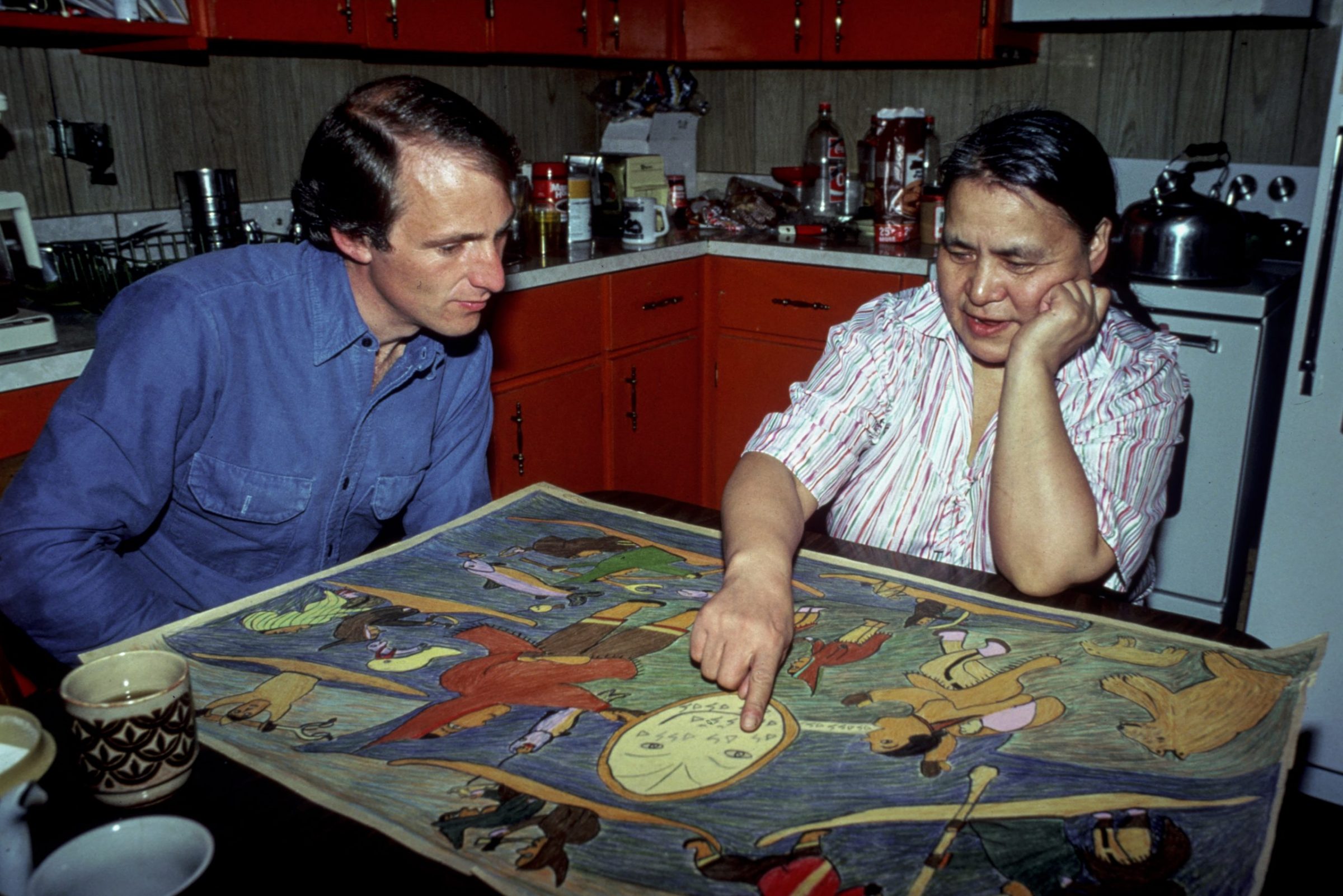 Ruth Annaqtuusi Tulurialik and David Pelly work at her kitchen table in Baker Lake in 1984. Pelly says Tulurialik taught him how to collect oral histories. (Photo courtesy of David Pelly)