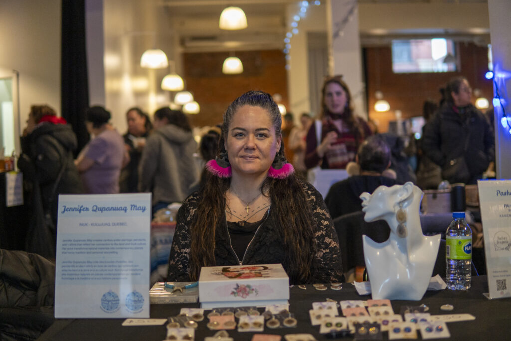 Jewelry makers Ella Levin, left, and Amoudla Kootoo display their wares as customer Assol Kubeisinova tries on a pair of earrings in the mirror. The pair were among dozens of vendors who participated in the Christmas Craft Fair at the Aqsarniit hotel Saturday in Iqaluit. (Photo by Daron Letts)