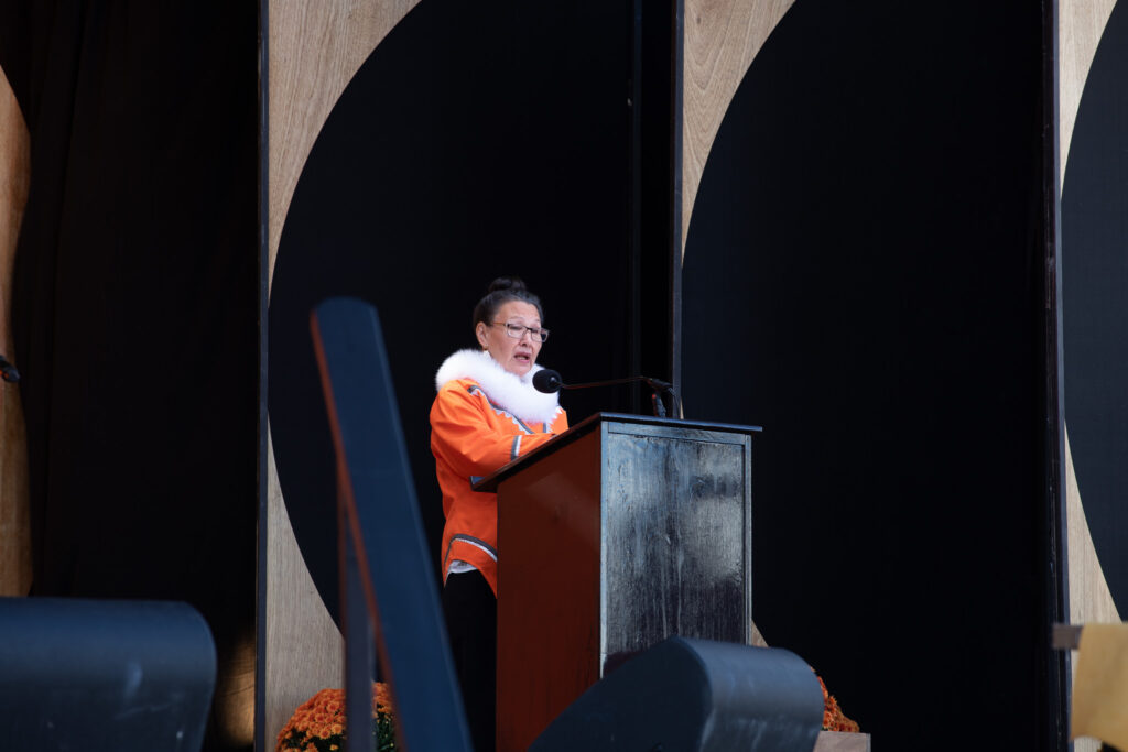Inuk elder Reepa Evic-Carleton calls on youths to “keep going, learn from our role models and be proud of who you are.” She is seen speaking Tuesday at the fifth annual National Day for Truth and Reconciliation ceremony on Parliament Hill. (Photo by Jorge Antunes)