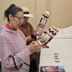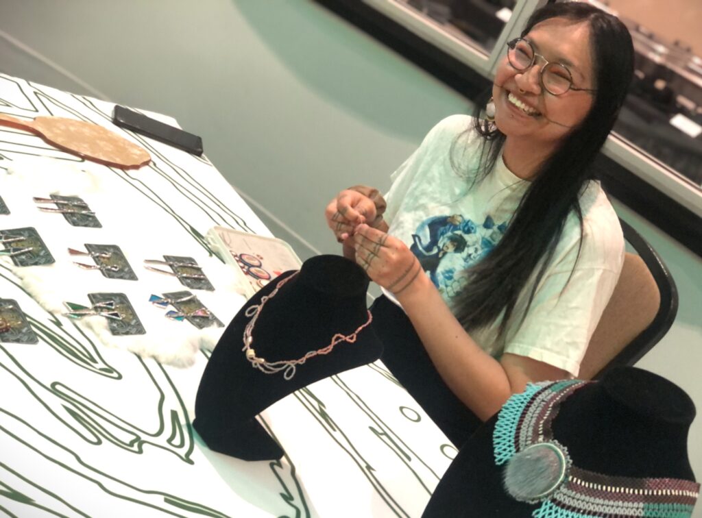 Iqaluit artist Yurak, who goes by one name, works on beaded jewelry Wednesday in the foyer of the Aqsarniit hotel in Iqaluit. Yurak was taking part in an arts market at the entrance to the Nunavut Trade Show and Conference, which is being held at the hotel and continues through Thursday. (Photo by Daron Letts)