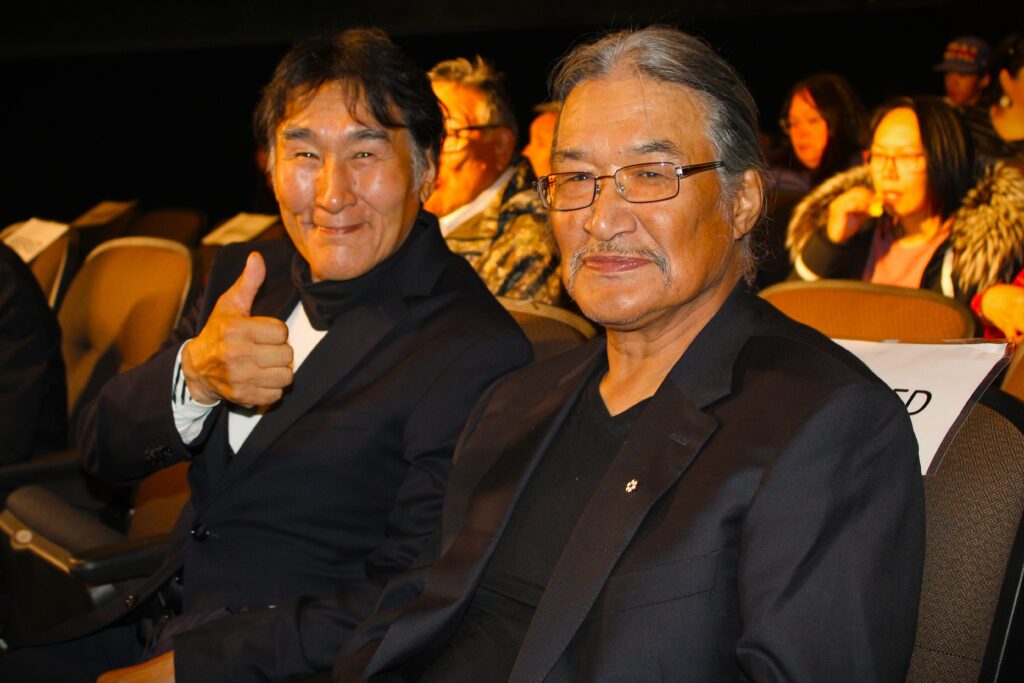 Acting coach Natar Ungalaaq, left, and director Zacharias Kunuk sit in the Astro Theatre in Iqaluit Friday as they await a free screening of Kunuk’s film “Uiksaringitara (The Wrong Husband).” The filmmaker and actors stayed for a question-and-answer session with the audience. The film was named best Canadian feature film at the Toronto International Film Festival this month. (Photo by Daron Letts)