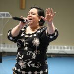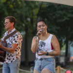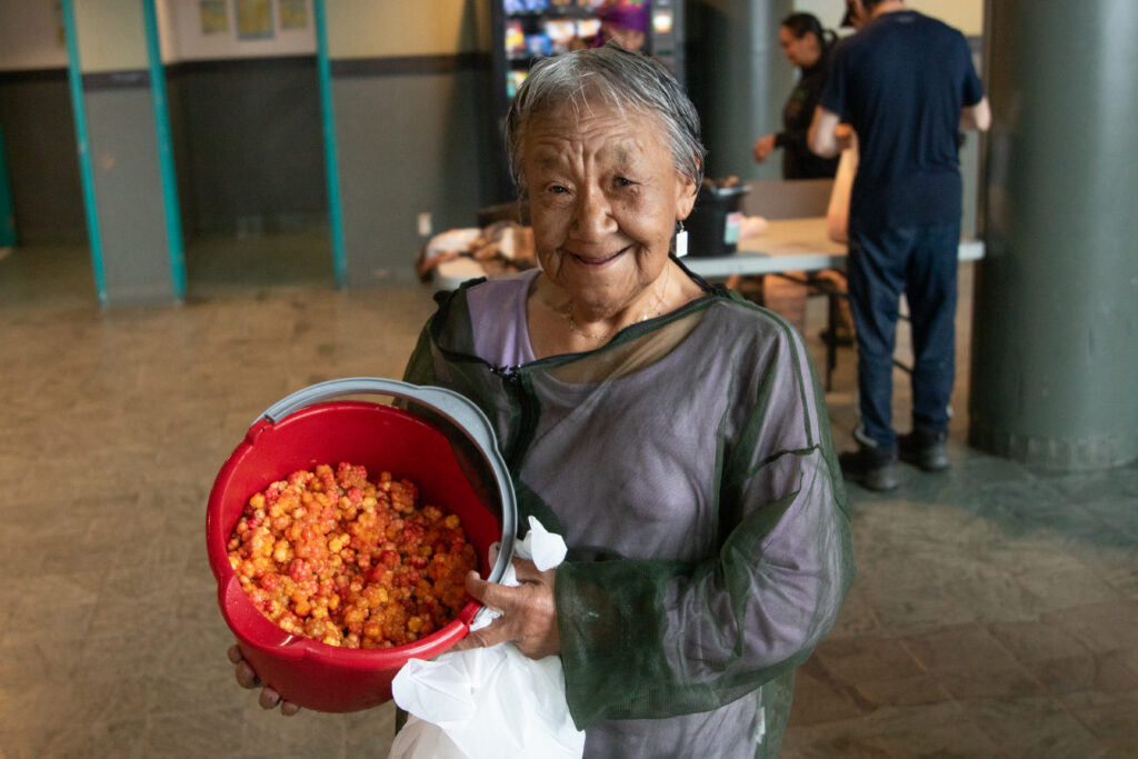Lizzie Lingard lines up at the Kuujjuaq Forum to have her haul of aqpik berries weighed Wednesday afternoon. She and dozens of others headed to the forum lobby around 4:30 p.m. as the Aqpik Jam musical festival berry-picking competition came to a close. Seventy-seven people registered for the contest, which was organized by Kuujjuaq Pinguatitsijingiit Inc., the community’s recreation committee. Jessie Mesher won the first-place prize of $1,500 for collecting the biggest haul at 18.8 pounds of berries. (Photo by Jeff Pelletier)