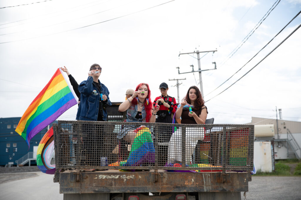 A float full of Pride participants wave from a float Saturday during Kuujjuaq’s fifth annual Pride event. From left are Allie Miot-Bruneau, Niivi Snowball, Charlie Saunders and Aputi Arnatuinak. (Photo by Jorge Antunes)