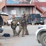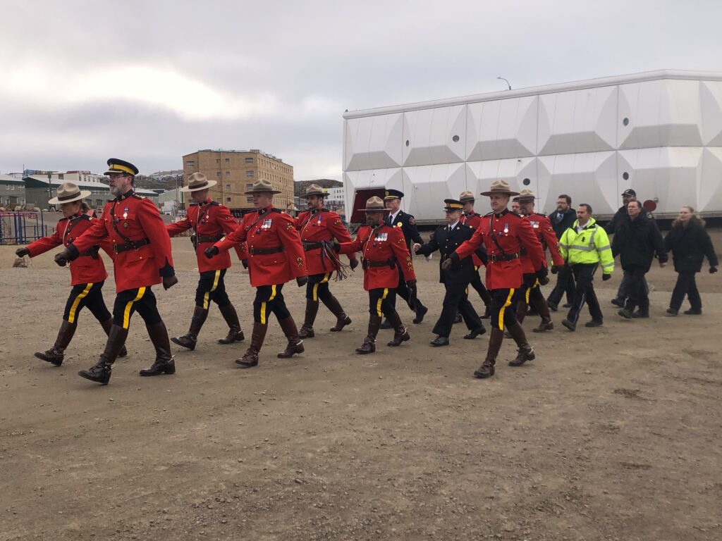 Officers from the RCMP’s Nunavut division march across the Nakasuk Elementary School grounds Sunday morning on their way to St. Jude’s Anglican Cathedral in Iqaluit. They attended a church service as part of the national police and peace officers’ national memorial day. It’s an annual event to honour police and peace officers who have died in the line of duty. (Photo by Daron Letts)