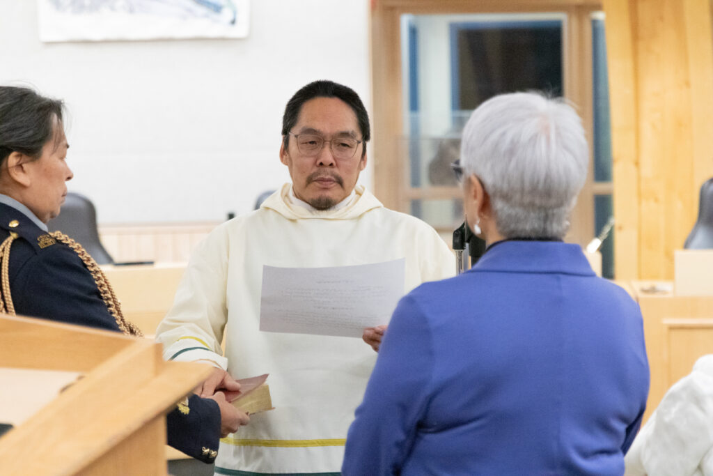 Aggu MLA Edward Attagutaluk takes the oath of office at the Nunavut legislature in Iqaluit Thursday. He won the re-do election in Aggu after the initial October vote ended in a tie. The other 21 MLAs were sworn in in November. This week, Attagutaluk is getting oriented at the legislature, which he said he had never been inside before. “Igloolik is not being left out anymore,” he said, adding he’s “ready to get to work.” With him are RCMP Staff Sgt. Maj. Pauline Melanson, left, and Nunavut Commissioner Eva Aariak, right. (Photo by Jeff Pelletier)
